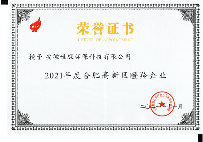 為深入實施創(chuàng)新驅動發(fā)展戰(zhàn)略,加快培育一批創(chuàng)新能力強勁、發(fā)展?jié)摿薮?、競爭?yōu)勢突出的高成長企業(yè),自2018年以來,合肥高新區(qū)已連續(xù)四年開展高成長企業(yè)梯度培育工作,安徽世綠環(huán)保科技有限公司在2019年、2020年連續(xù)兩年被認定為高成長雛鷹企業(yè)后,在2021年11月被認定為合肥高新區(qū)高成長瞪羚企業(yè)。