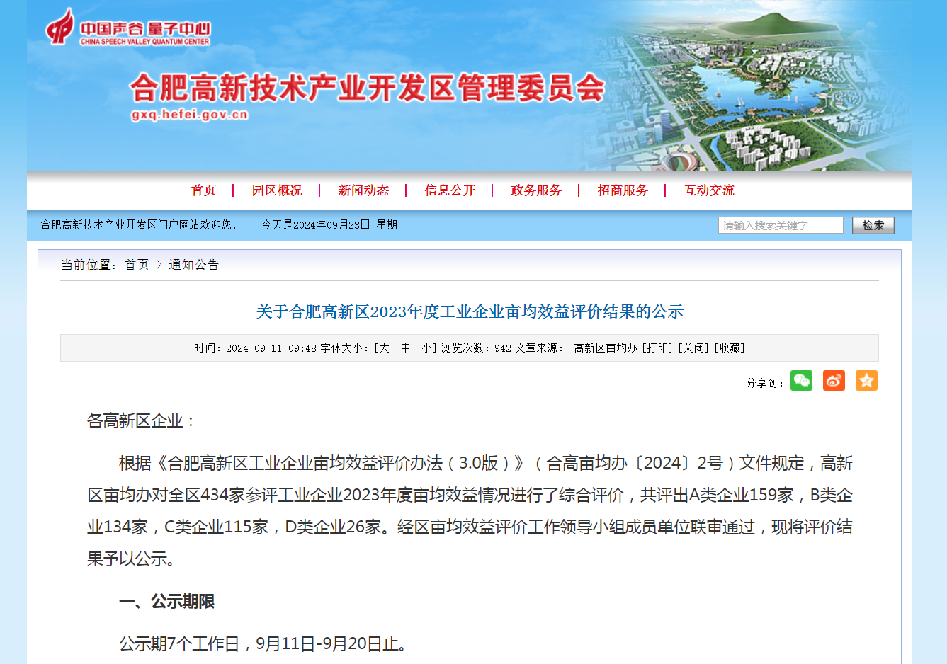 根據(jù)《合肥高新區(qū)工業(yè)企業(yè)畝均效益評(píng)價(jià)辦法(3.0版)》(合高畝均辦〔2024〕2號(hào))文件規(guī)定,高新區(qū)畝均辦對(duì)全區(qū)434家參評(píng)工業(yè)企業(yè)2023年度畝均效益情況進(jìn)行了綜合評(píng)價(jià),共評(píng)出A類(lèi)企業(yè)159家,B類(lèi)企業(yè)134家,C類(lèi)企業(yè)115家,D類(lèi)企業(yè)26家。經(jīng)區(qū)畝均效益評(píng)價(jià)工作領(lǐng)導(dǎo)小組成員單位聯(lián)審?fù)ㄟ^(guò),近期對(duì)評(píng)價(jià)結(jié)果予以了公示。