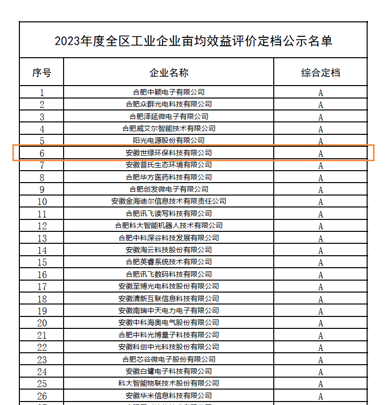 世綠環(huán)保畝均效益評(píng)價(jià)定檔為A檔